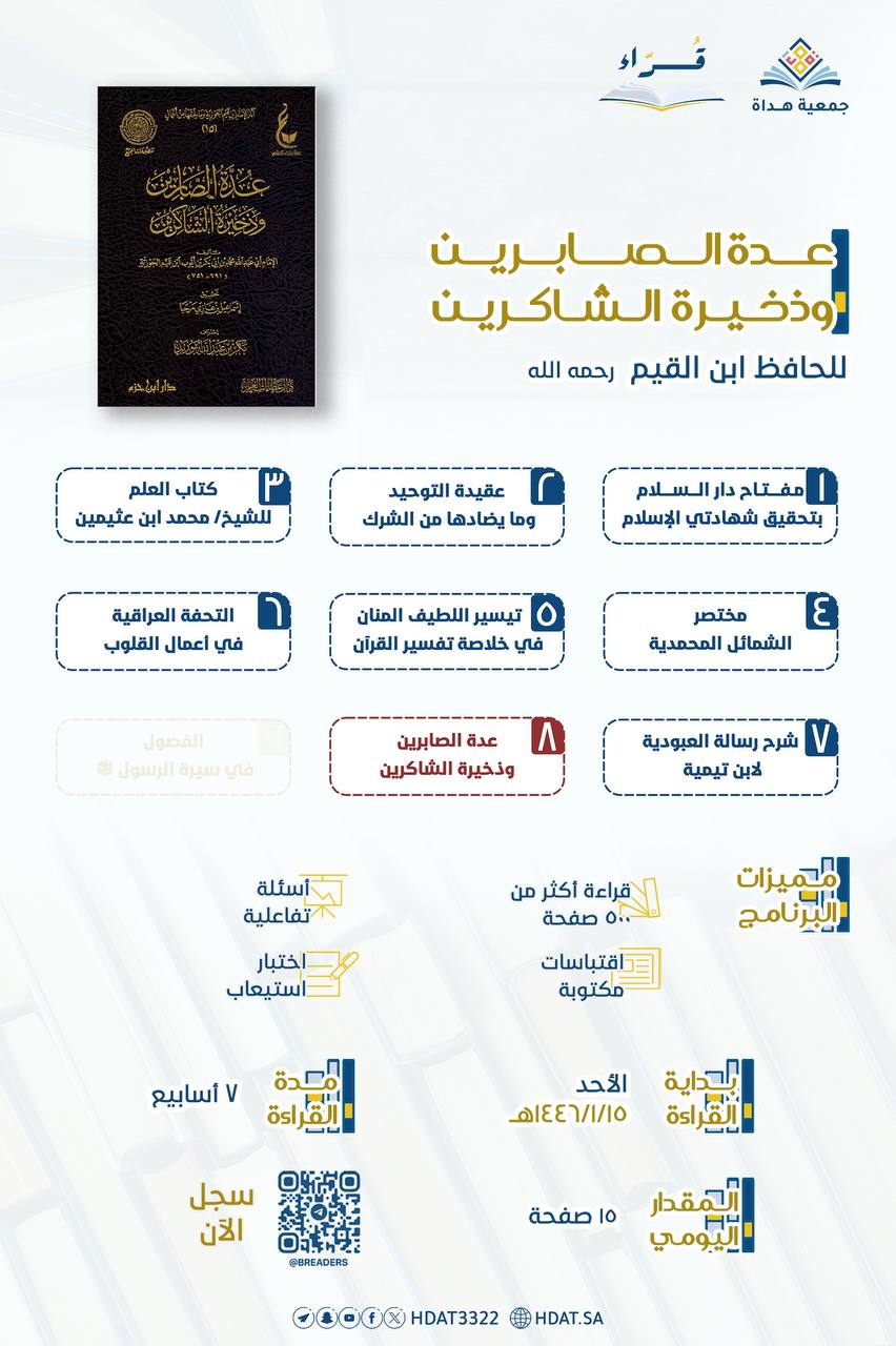 بدأت القراءة في كتاب عدة الصابرين وذخيرة الشاكرين استكمالًا لمسيرة برنامج قراء في قراءة الكتب النافعة